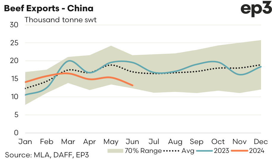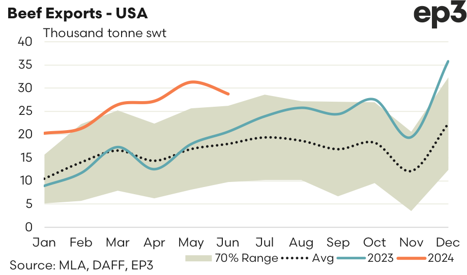 Japan – May to June saw beef exports from Australia to Japan sit consistent at around 25,000 tonnes each month and the solid result here contributed to the strongest Q2 results for beef exported to Japan since Q2, 2019. There was a total of 72,777 tonnes shipped to Japan in the second quarter of 2024, which is 36% higher than Q2, 2023 and 13% above the Q2 average flows based on the last five-years of the trade.