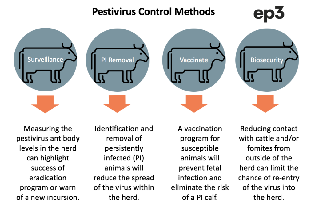 A systematic control strategy includes the removal of persistently infected (PI) animals from infected herds, biosecurity measures aimed at preventing the re-introduction of the virus, and surveillance methods to monitor the progress of the management program and detect pestivirus incursion within susceptible herds. A systematic approach can also include the implementation of a co-ordinated vaccination programme, either at a regional or national level.