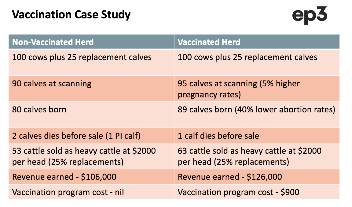 A simple example of the reproductive benefits to using a vaccination program based on the outcomes highlighted by the Auburn University study for a beef breeding herd is outlined below: