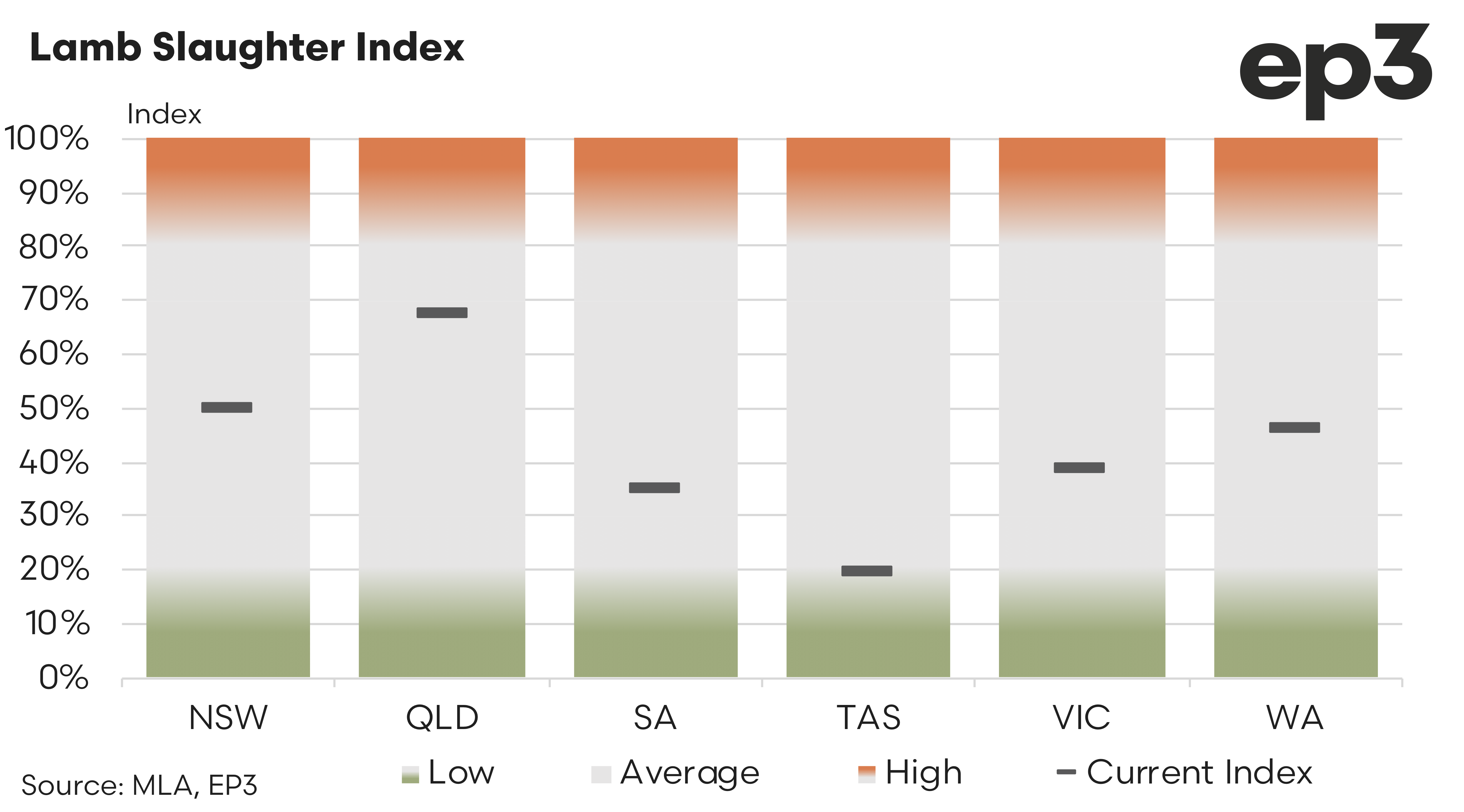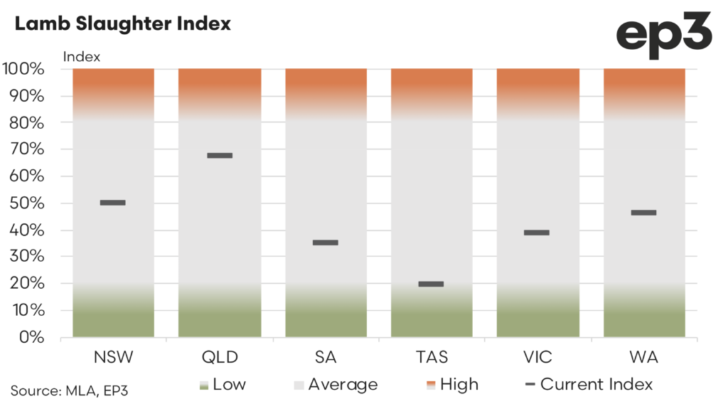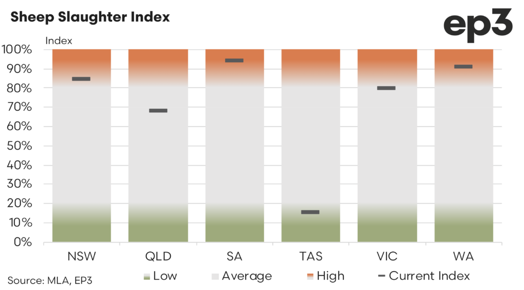 The sheep slaughter index diagram displayed highlights how current slaughter levels, as measured by the average weekly slaughter volumes over the last month, compares to the historic weekly slaughter volumes within each state for the last five years. Think of each respective state column is a little bit like a rain gauge, but instead of measuring how many millimetres you have received overnight they are measuring how many sheep are being processed presently within each state relative to the recent volumes.