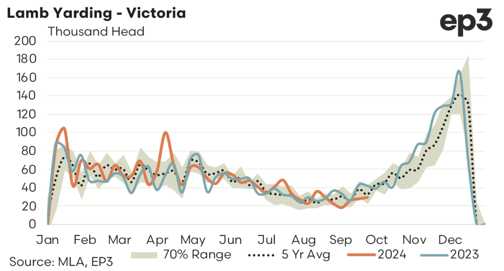 Indeed, average weekly lamb yarding levels in Victoria during September was close to 25,000 head, which is about 10,000 head below what was presented at saleyards in Victoria during September last year and around 7,000 head below what you could expect to see each season in September, based on the last five years of throughput data. In percentage terms the current Victorian lamb supply at the saleyards is running nearly 22% below the usual levels you could expect to see at this time in the season.