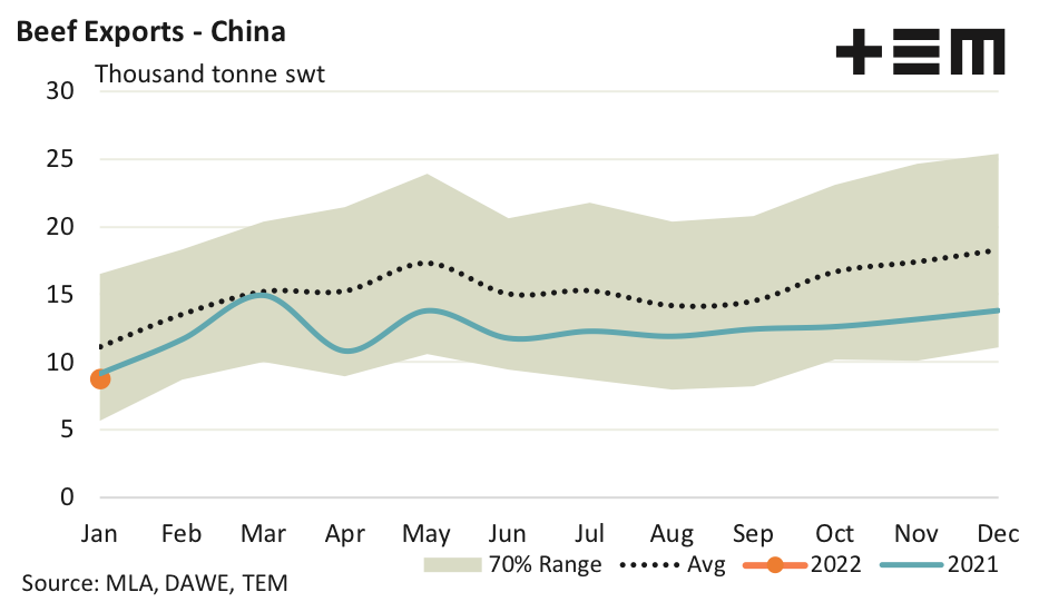 - January 2022 saw relatively stable volumes of beef consigned to China, just 4% under the levels set in 2021. Although they remain 21% below the five-year January average levels.