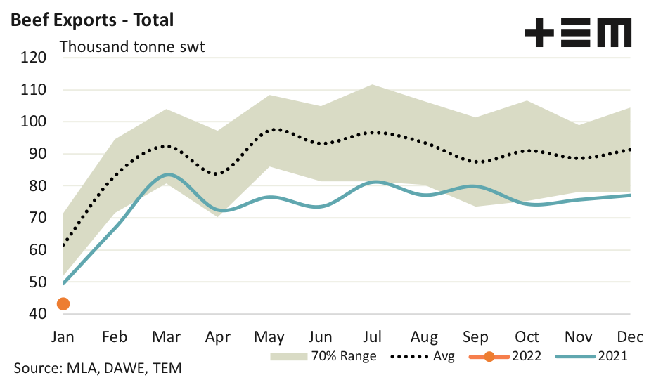 - January 2022 total beef export volumes have come in 13% softer than last year and 30% under the five-year average trend for January.