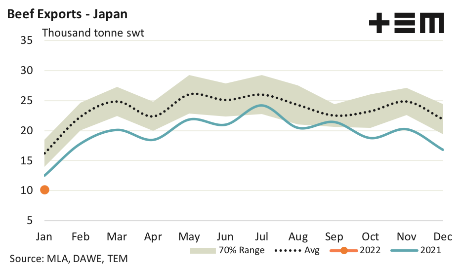- Beef exports to Japan in January are 19% under the flows seen during January 2021 and are 37% below the five-year seasonal average pattern.