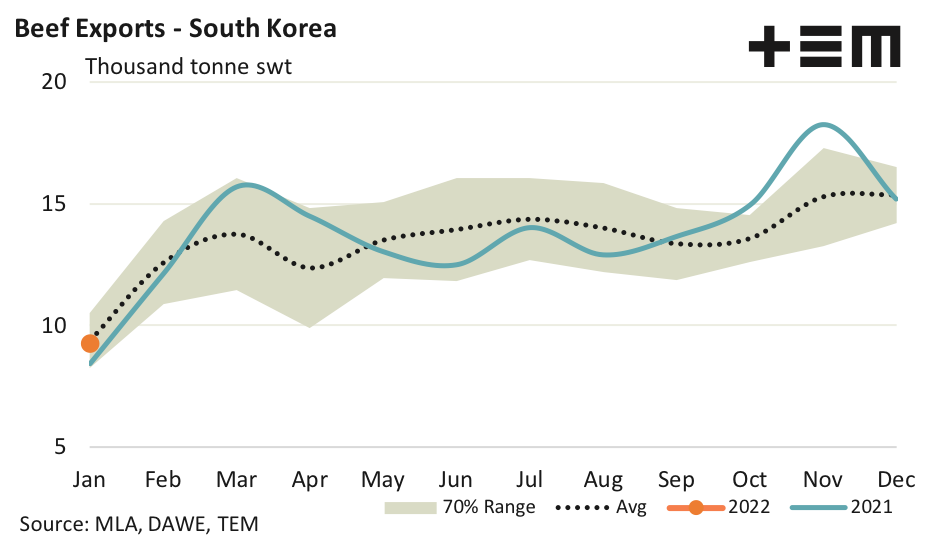 Beef exports to Japan in January are 19% under the flows seen during January 2021 and are 37% below the five-year seasonal average pattern. In contrast, South Korean demand for Aussie beef remains pretty solid and has started 2022 relatively well. Volumes for January 2022 to South Korea came in at 9,288 tonnes swt, 10% higher than in 2021 and just 1% under the five-year average for January.