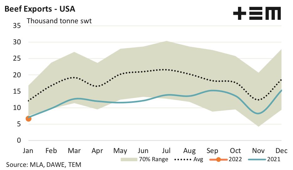 Meanwhile the USA have started the season as poorly as it began 2021 with Aussie beef exports of just 6,758 tonnes, which represents levels that are 4% less than the volumes seen during January 2021 and 44% below the five-year average seasonal pattern for this month in the year.