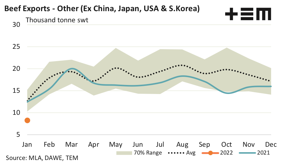 Australian beef flows to the remaining offshore destinations (excluding the top four trade locations of Japan, South Korea, China and the USA) started 2022 in a underwhelming fashion with just 8,322 tonnes reported shipped. This is 33% lower than the volumes seen during January 2021 and has come in 35% below the five-year average for January.