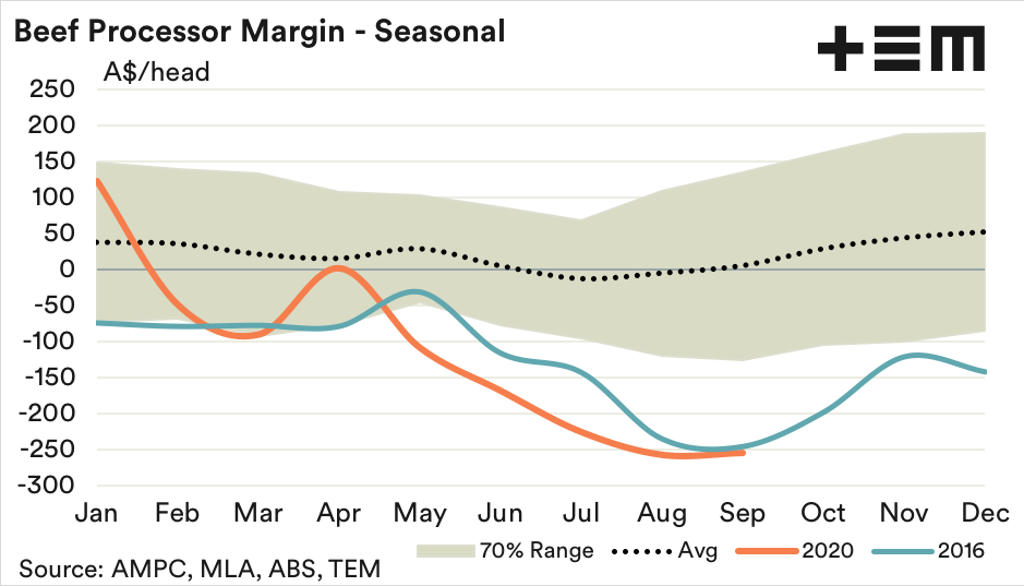 Concerns over tighter beef supply in the US heading into the final quarter of 2020 may see a lift to beef export prices for Australian processors. This could encourage further improvement in processor margins as we head toward the end of the year, but it is unlikely to be enough to get them back into positive territory over the short term.