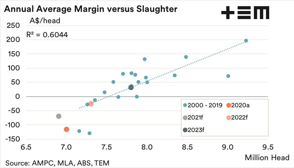 - Analysis of the relationship between annual slaughter levels and the annual average processor margin shows that currently the low herd numbers and tight slaughter environment is pushing the margin toward record negative territory.