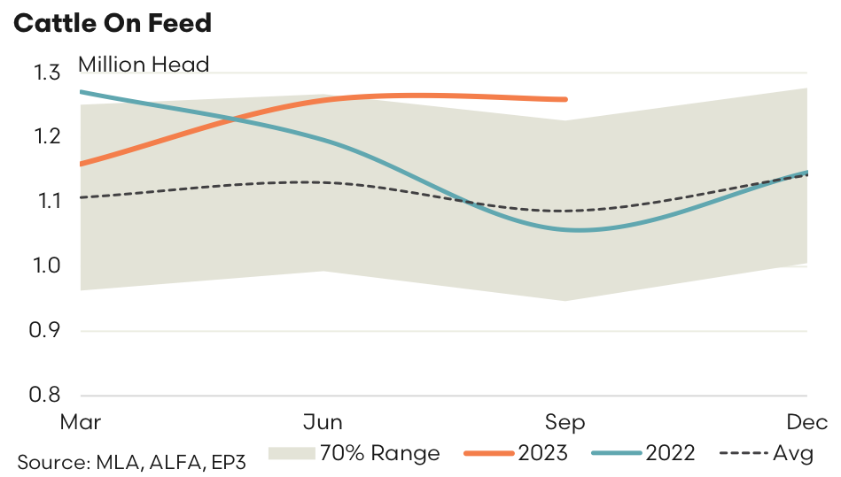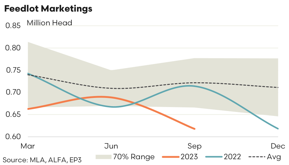Feedlot turnoff over the September 2023 quarter declined by 10.2% from the levels marketed in June to see just 618,017 head of cattle turned off. Compared to September quarter 2022 turnoff volumes are down by 13.4% this season and 14.4% lower than the average September turnoff based on the last five years.