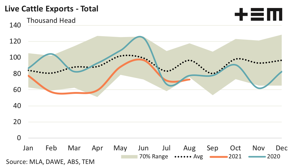 - August 2021 saw live cattle export volume lift by 1,323 head from the prior month to see 72,774 cattle transported offshore.