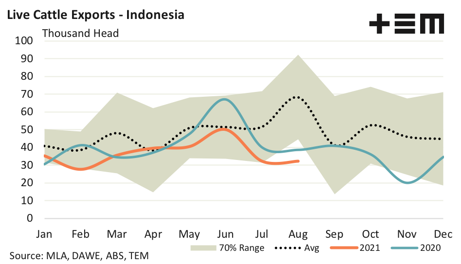 Live cattle exports to Indonesia for August were nearly identical to the July flows with 32,327 head noted. Historically, August has been a good trading month for Australian live cattle exports to Indonesia, with an average of more than 68,000 head shipped over the past five seasons during August. High domestic pricing and the record low supply of cattle clearly making an impact on volumes to our primary live cattle export market.