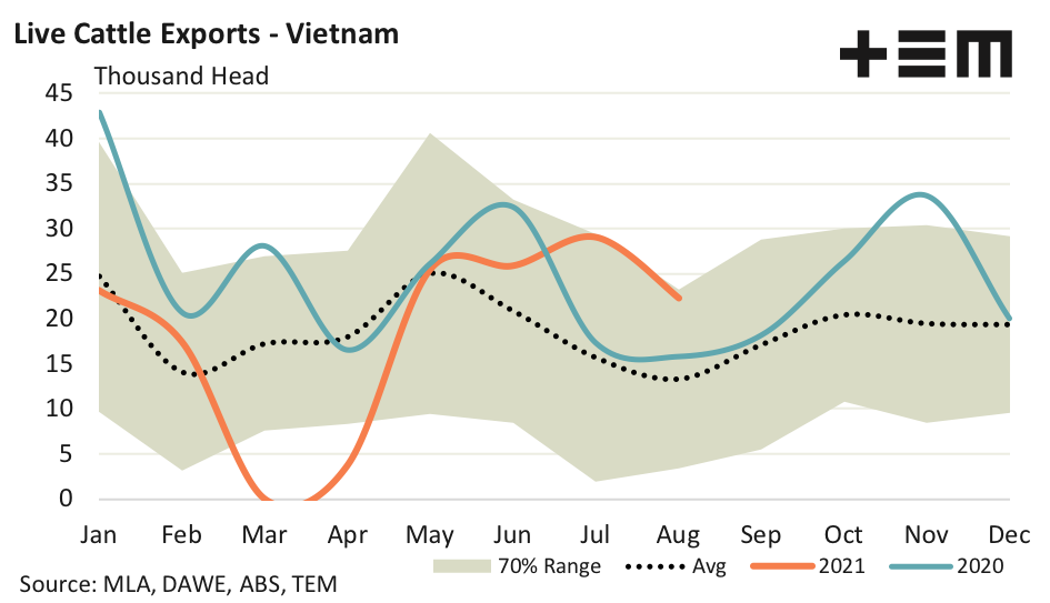 - There were 22,302 head of cattle exported from Australia to Vietnam in August, 68% higher than the five-year August average.
