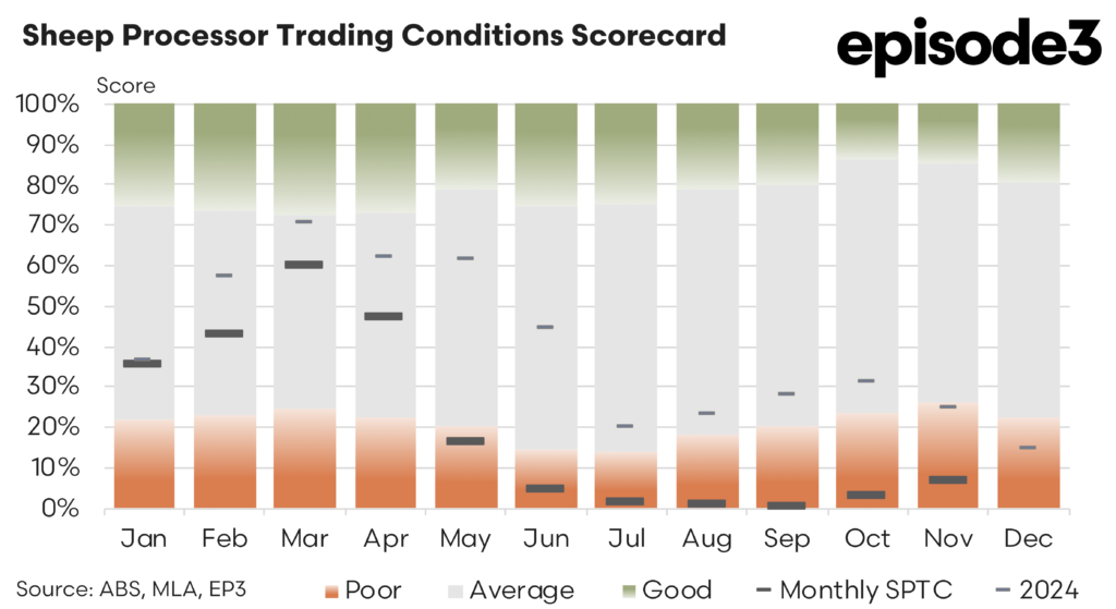 Domestic conditions were also mildly supportive during October. Retail lamb prices increased by around 1.6 percent, offering some additional downstream price support, although the pass through of retail price movements to processor margins remains limited and uneven. Nonetheless, the combination of lower livestock costs, stronger export returns and modest domestic price gains was sufficient to lift processor trading conditions to their strongest level in several months.