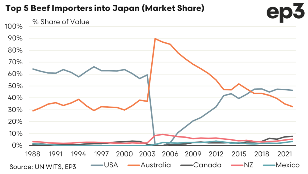 Japan is Australia’s top market for beef exports and we really have just one main competitor in that space – the USA. An outbreak of Bovine Spongiform Encephalopathy (BSE, or more commonly known at Mad Cow Disease) took the US out of the Japanese market from 2003 to 2006, but since then they have been steadily regaining their trade position.