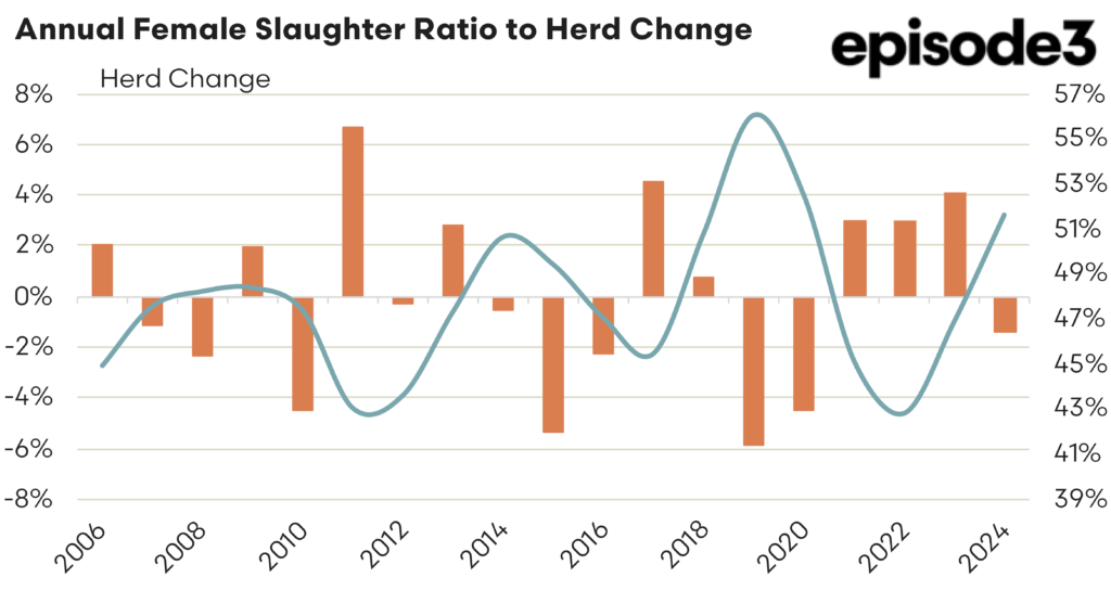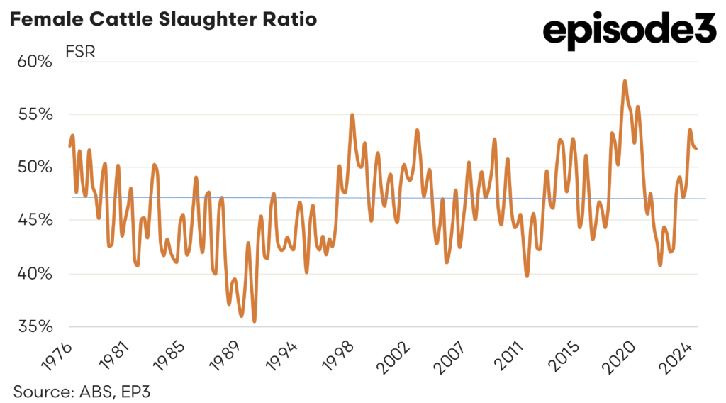 The Q4, 2024 female slaughter ratio (FSR) came in at 51.8%, down from 52.2% in Q3. This means that the national cattle herd is still in a liquidation phase, as we are above the 47% threshold. But we have seen a slight pullback showing a weakening liquidation pattern. There is likely a bit of a two speed situation at present across the country with some northern regions favouring rebuild while southern players are still a little too wary to start increasing their herd.