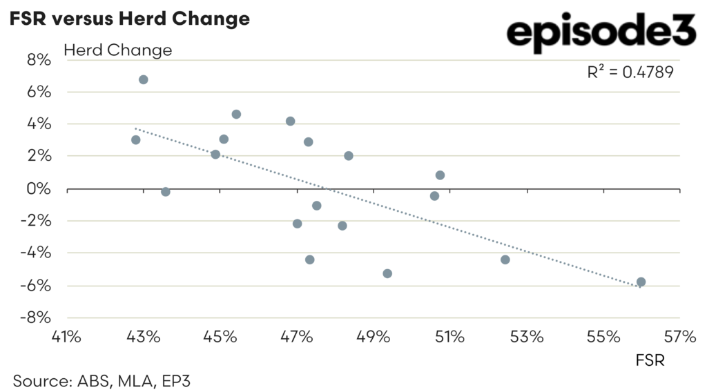 An annual average FSR in the mid 51% area, as we have currently, is consistent with these types of magnitude national herd decline in percentage terms. As the scatter plot of annual herd change to annual average FSR from 2005 onwards shows below (taking the line of best fit) an FSR above 47% is usually consistent with herd decline, while an FSR below 47% is usually consistent with herd rebuild. Again, the line of best fit demonstrates that an FSR around 51.5% is consistent with the herd dropping by 2-3% as per the MLA forecast.