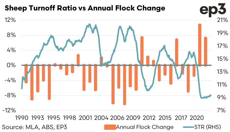 Australian Bureau of Statistics (ABS) sheep slaughter figures for the December quarter 2022 have been released today and when combined with sheep live export volumes we can measure the proportion of sheep being turned off as a percentage of the flock, also known as the Sheep Turnoff Ratio (STR).