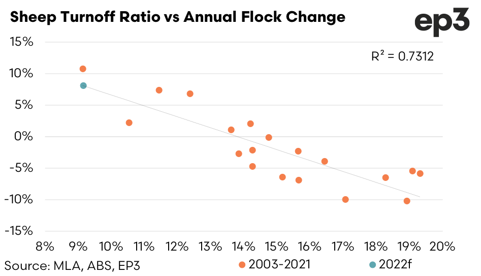 The Q4 2022 STR came in at 9.4%, bringing the annual average STR to 9.2% for the entire 2022 season. In 2021 the STR averaged 9.1% and the flock grew by nearly 11% that year. A scatter plot of annual average STR versus percentage flock change shows that an STR of 9.2% for 2022 is consistent with the flock growing by about 8%, which is pretty much in line with the MLA expectations according to their recent release of the 2023 sheep industry projections.