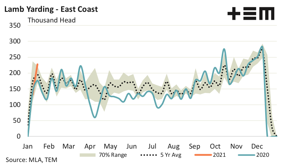 - East coast lamb yarding levels are running 16% above the five-year seasonal pattern for this time in the year.