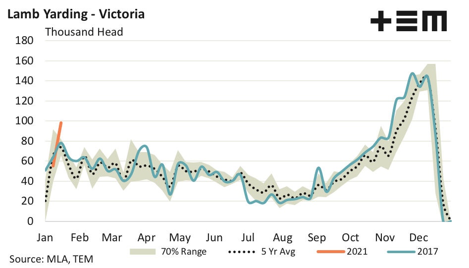 Victorian lamb yarding levels are underpinning the strong east coast throughput figures with weekly yarding numbers reaching 97,986 last week, 33% above the five-year average seasonal pattern and 39% more than the same week in 2020.