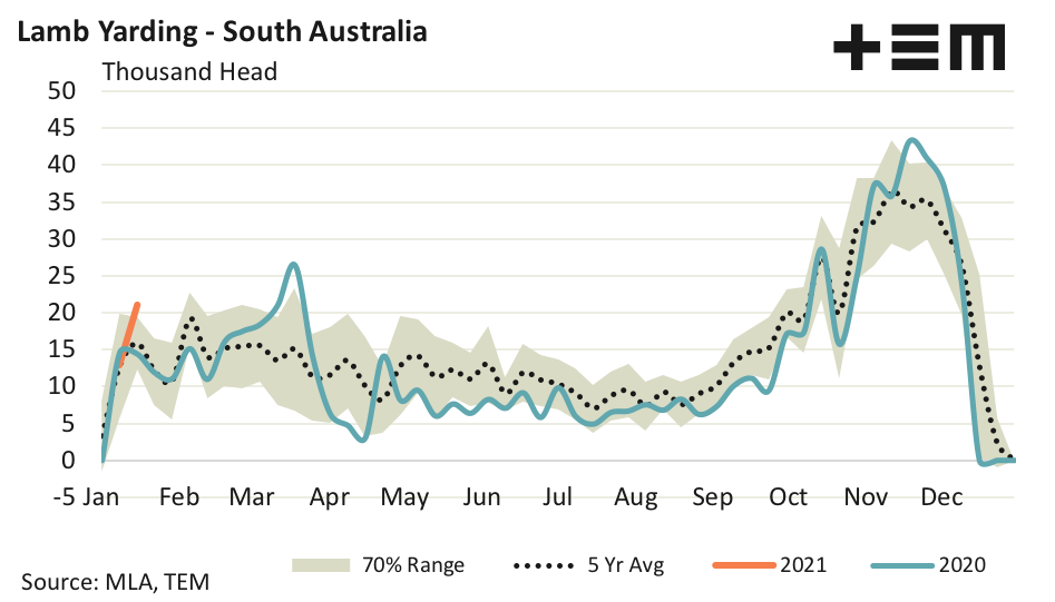 South Australian lamb throughput volumes are mirroring the Victorian strength, opening the season 33% above the five-year average trend and 46% higher than during the same time period in 2020.