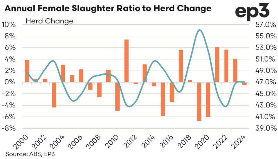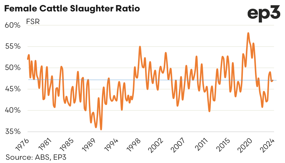 Last week saw the release of the first quarter 2024 Australian Bureau of Statistics (ABS) cattle slaughter figures. Analysis of the data shows us how the female slaughter ratio (FSR) has opened the season after the annual average FSR finished 2023 at 46.8%, just 0.2% under the threshold level between herd rebuild and herd liquidation.