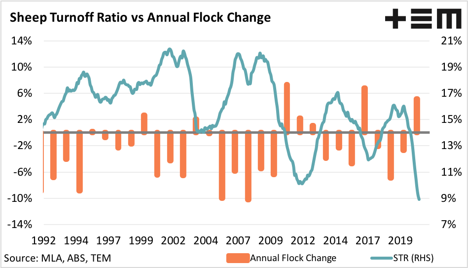 The STR measures the total turnoff of sheep in Australia (slaughter and live export) as a proportion of the flock size, expressed as a rolling twelve month average percentage figure. Historically, when we compare the annual flock change to the STR we note that when the STR is below 14% we see flock rebuild. Similarly, when the STR is above 14% we often see flock liquidation take place.