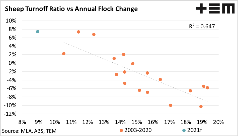 A comparison of the annual average STR to the annual flock change highlights a reasonably strong correlation between the two series, with a correlation coefficient of 0.647. The line of best fit demonstrates that an annual STR of 9% suggests an increase to the flock of 7.4% isn’t out of the question in 2021.