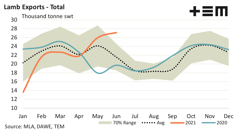 - Total Australian lamb exports for June increased by 4% to reach 27,100 tonnes swt, the largest monthly flows in just over two years.