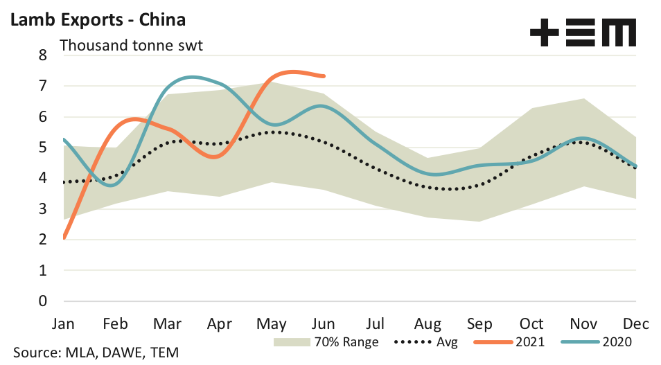 Thankfully lamb export demand isn’t just a one horse show, with Chinese consumers also demonstrating some solid interest. The June 2021 lamb export volumes remained outside the upper end of the normal range hitting 7,312 tonnes swt, a rise of 1% on the previous month.