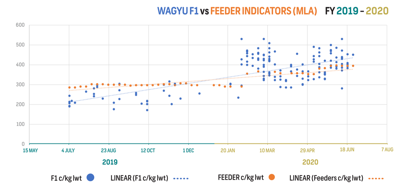 During the 2018/19 season a flood of F1 Wagyu saw prices and Wagyu premiums come under significant pressure. However, recent price data from the Australian Wagyu Association website (data provided by Auctions Plus) shows that Wagyu premiums have returned to the sector during 2020.
