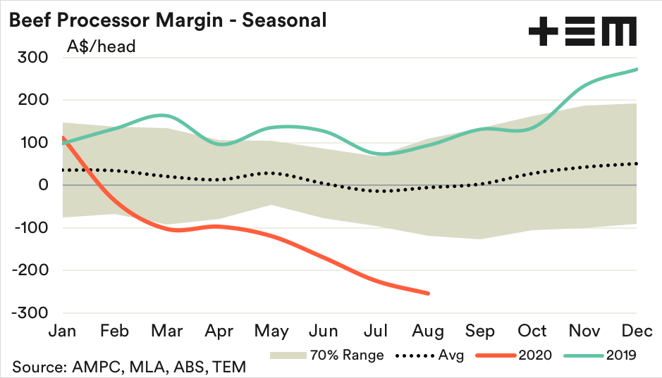 The tough trading environment for beef processors has seen the monthly margin extend to the largest loss in the last two decades, according to the EP3 theoretical model. The $254 loss recorded for August 2020 a fraction over the $247 loss from September 2016.