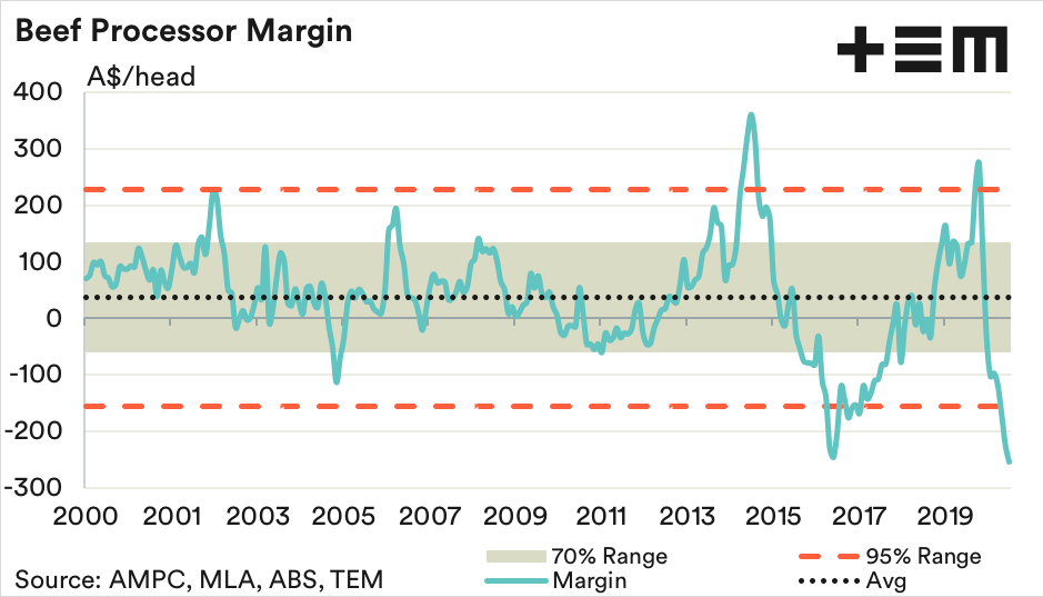 • Beef processor margins above a $230 profit or below a $155 loss would be considered extreme