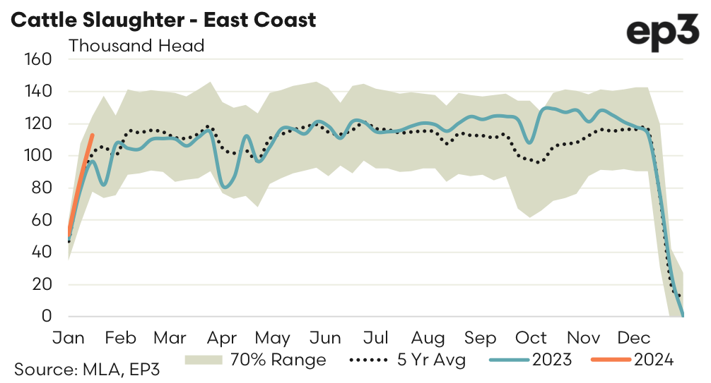 It has been a strong start to 2024 for Australian red meat processing volumes across the east coast with beef and sheep meat abattoir throughput running ahead of annual average trends. East coast cattle slaughter has average weekly kills of nearly 83,000 head since the start of January, which is 11% higher than the January 2023 open and about 8% above the five-year average weekly pattern.