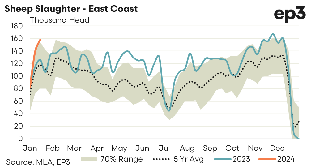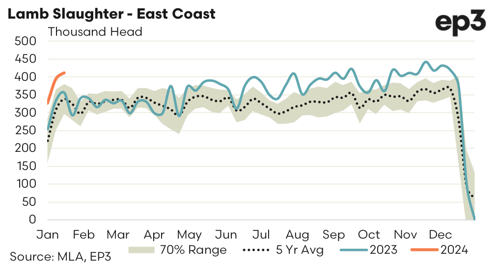 The start of the year for east coast lamb slaughter volumes has been similarly impressive with average weekly January kill volumes sitting at nearly 377,000 head per week. During the same time in January 2023 strong volumes were also recorded (circa 315,000 head per week) but current lamb abattoir throughput is running 20% higher than this time last year. Compared to the five-year average trend for January the current season is even more robust, sitting 30% above the five-year seasonal trend.