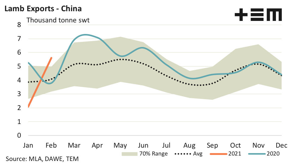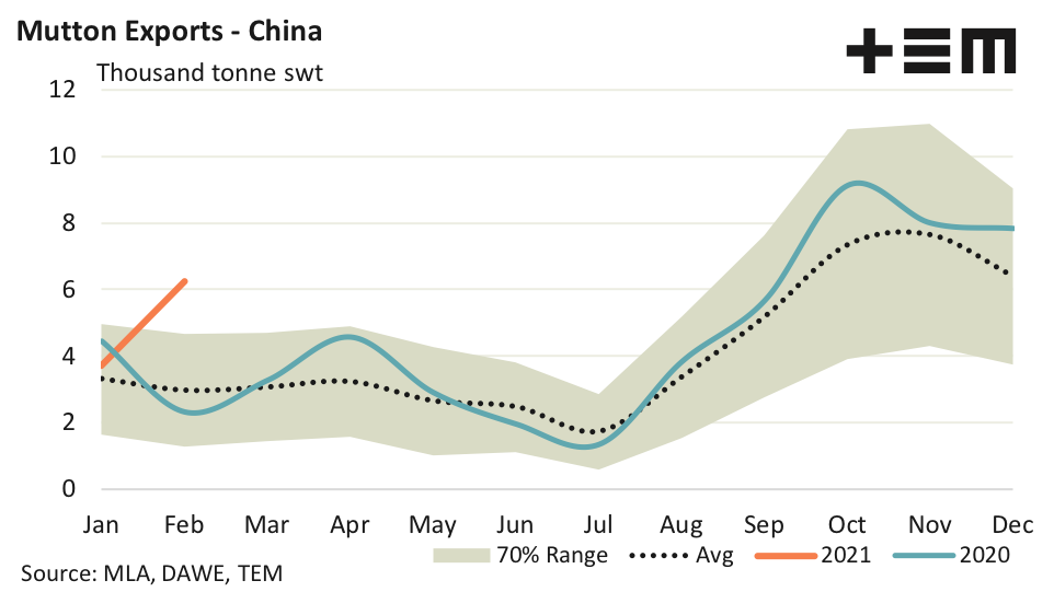 - February mutton volumes to China also performed well, lifting 69% over the month to register 6,242 tonnes swt exported.