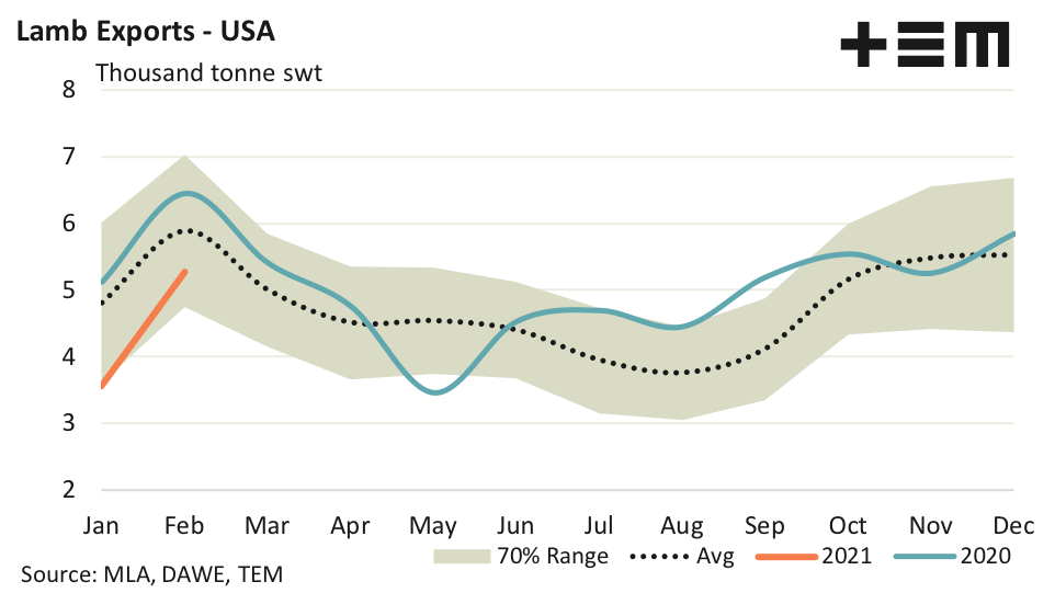 - Meanwhile, lamb export consignments to the USA saw a 48% lift from their January levels to see 5,277 tonnes shipped.