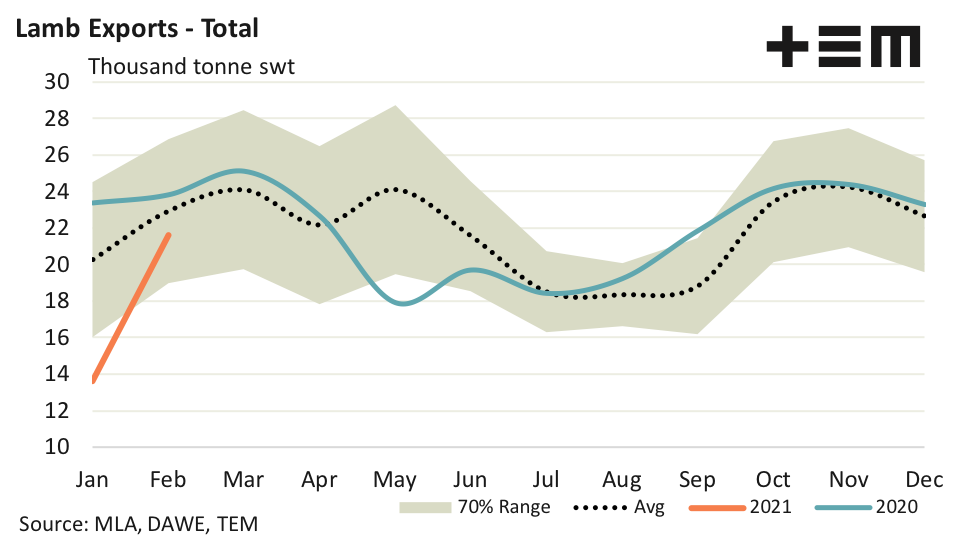 A look at total lamb exports from Australia highlights a strong recovery from the poor start to the season. Total exports lifted 59% over the month to record 21,607 tonnes swt consigned. This represents a level that is just 6% under the five-year average seasonal pattern for February.