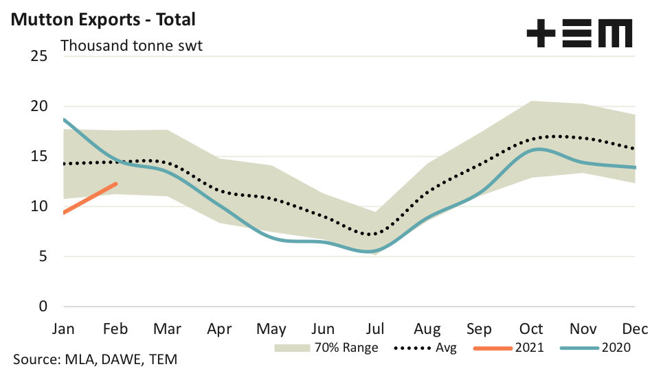 The strong lift in Chinese demand for mutton supported a broader increase to total mutton exports from Australia over February to see a 30% gain in total volumes from the January figures. Total mutton shipments recorded 12,228 tonnes swt for February, a level that is 15% under the five-year seasonal pattern for February.