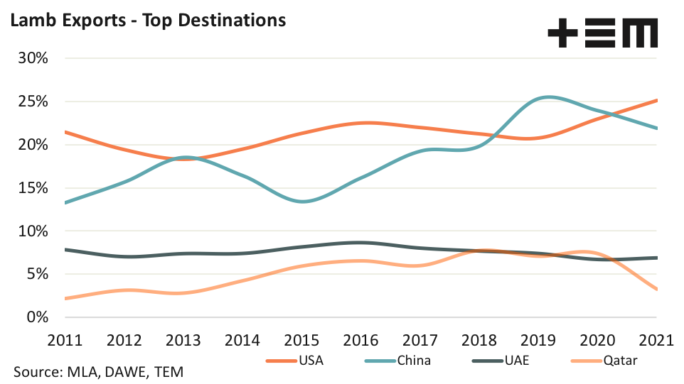 The market share for our top lamb export destinations shows that flows to Qatar since the start of 2021 have eased back to levels consistent with their pre-import subsidy program at 3.3% of total lamb export flows. Last year Qatar ended a subsidy program that favoured Australian lamb earlier than expected and the result appears to be volumes easing with February recording just 423 tonnes of lamb shipped, 42% under the five-year February average pattern.