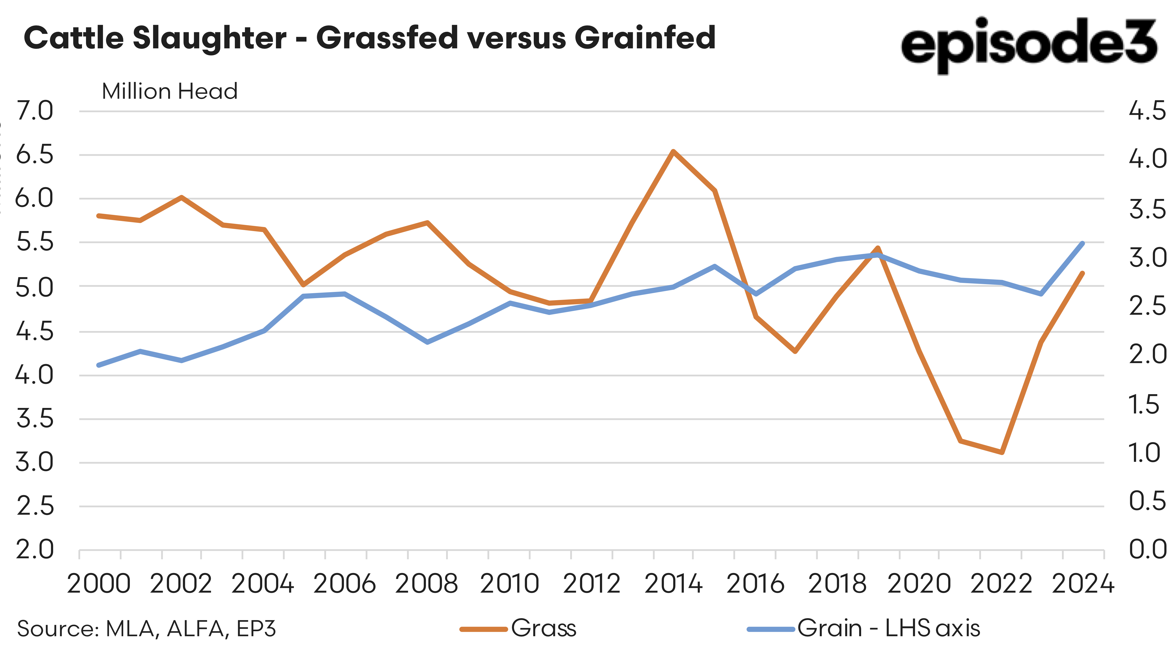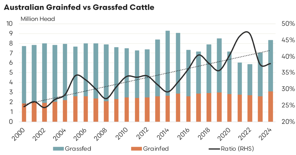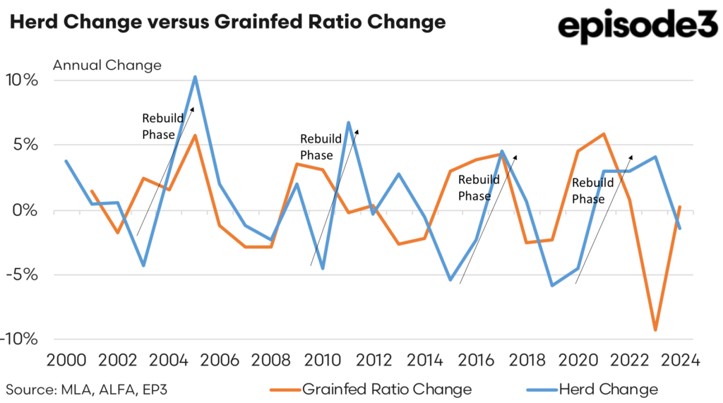 The ebbs and flows of grass versus grain cattle sector is something we have seen at least since the 2000s. It is not a new cycle or some kind of industry restructure that has occurred just in the last decade. As the chart below demonstrates reasonably clearly when comparing the change in the grainfed-ratio each year versus the change in the Australian herd numbers. A move to herd rebuild, due to more favourable seasonal conditions, promotes higher retention of cattle (particularly those that are grass finished when compared to the reasonably steady grain-fed turnoff numbers each year). So it stands to reason that the grainfed ratio will begin to rise as the herd swings into a rebuild phase and the ratio will tend to decrease somewhat as the herd goes into a liquidation phase.
