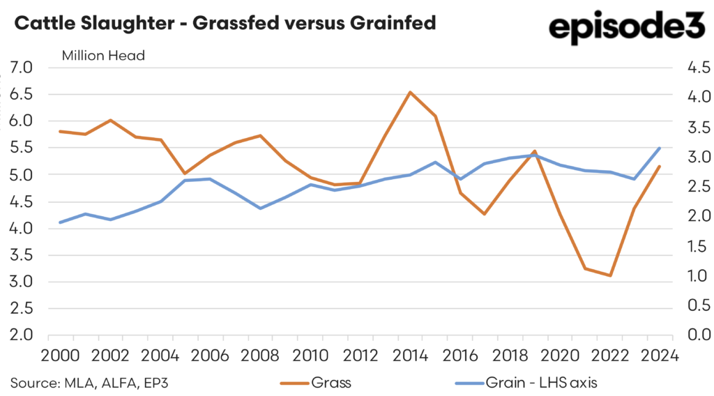 For example, the 2014/15 drought saw grass-fed slaughter peak at 6.5 million head and the 2016/17 rebuild phase saw it drop to just below 4.5 million head. The legacy of the millennial drought (particularly bad in 2001/02) saw elevated grassfed slaughter for the early 2000s and a very dry phase impacting SA/VIC/NSW and southern QLD in 2006/07 saw grass fed slaughter elevated once again. Meanwhile a much wetter 2010/11 period and a wetter 2021/2022 saw the grass fed slaughter dip to a low ebb in response to herd rebuild activity.