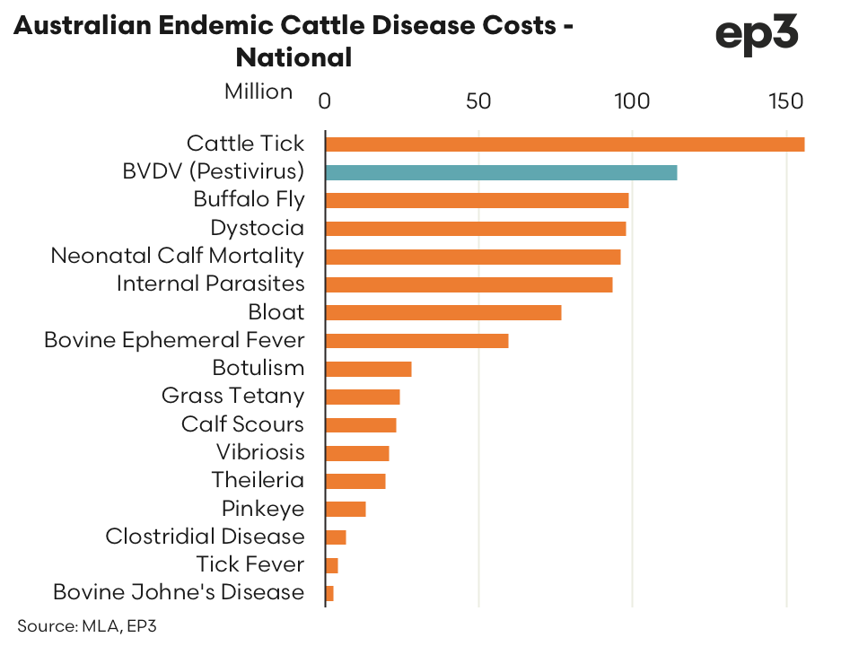 - $114 million per year in 2015 – Meat and Livestock Australia calculated the estimated cost of pestivirus in Australia was $114 million per year in 2015, only second to cattle tick. Australian cattle prices have doubled since that time.