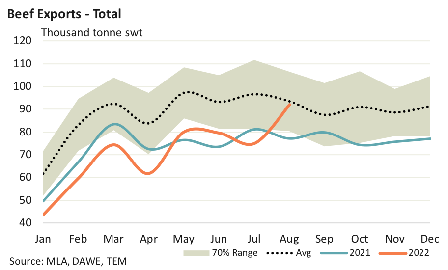 - Current total beef trade volumes for August sit just 1.5% under the August five-year average.