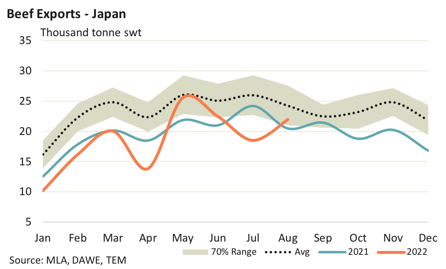 - Japan managed a 19% gain in beef export volumes over August but compared to the five-year August average current levels are sitting 9% under trend.