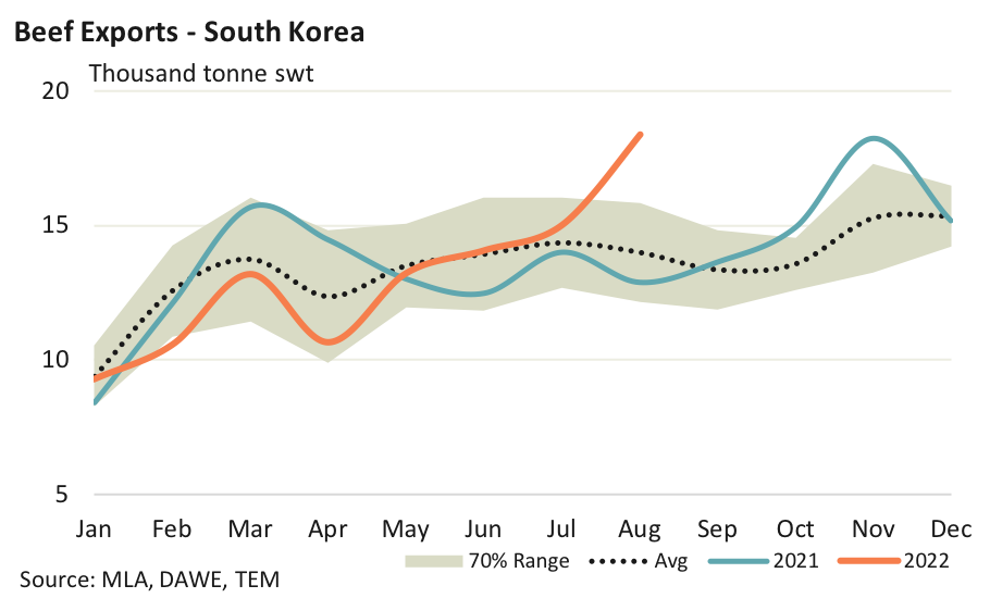 - South Korean beef trade volumes from Australia lifted 22% over the month to sit 32% above the August average level.