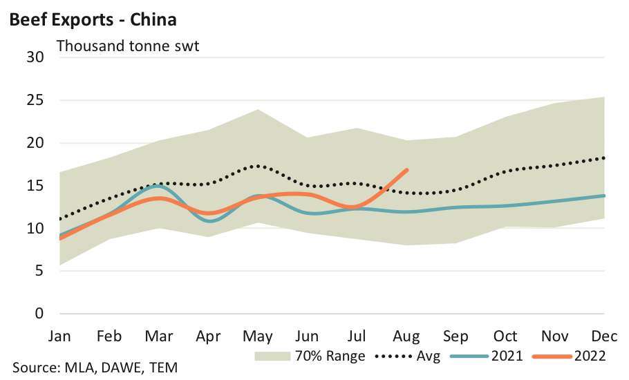 China managed to post a good lift in August with beef trade volumes from Australia gaining 34% to sit at 16,803 tonnes swt. Current beef trade volumes to China represent levels that are 19% above the August five-year average pattern.