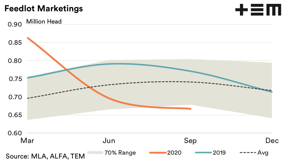 Feedlot marketings have stabilised at 666,822 head for September 2002, just a 4.2% easing from the June 2020 levels and significantly less than the 19.3% drop seen during the March to June quarters. Marketings are trending at the lower end of the normal seasonal range, but the very strong marketing levels in the March quarter means that average quarterly marketings for 2020 are running just 2.5% ahead of the five year pattern.