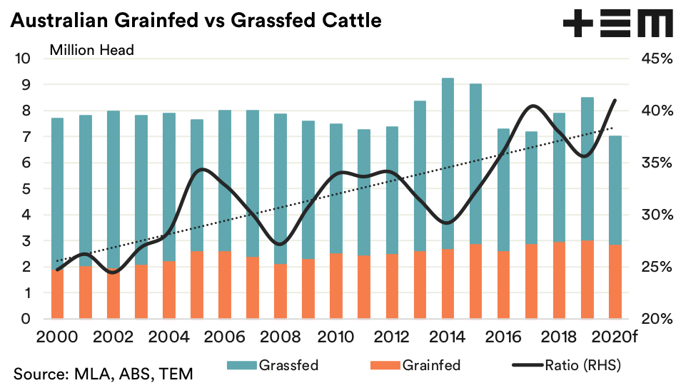 • Despite the lower grain fed turnoff this season, the lowest annual slaughter levels since 1996 mean that the ratio of grain fed to grass fed turnoff is expected to hit a record 41% at the end of the 2020 season.